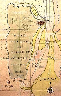 On leaving Pulau Kendi, he pulled into a bay on the southern coastline of Penang. At the mouth of the river which flows into the bay, he released a tame bird called Bayan, and thenceforth the place has been called Bayan Lepas (or the 'free Bayan'). At another voyage, he attempted to land again at the shore of that bay. However, the sea was too rough and as his boat pulled away from the shore, it was nearly swamped. The boat rolled and pitched heavily, and as he was steering her off, his exertions loosened the knot (or 'sanggul) of his long, flowing hair. He therefore named the place Gertak Sanggul ('shaken knot'). On another occasion, while passing Pulau Bitong on the western coast of Penang, he encountered a heavy gale. On passing a point on the island, the storm grew fiercer and he saw his wife's face turn pale with fear. He henceforth referred to that place as 'Pucat Muka' or 'pale-faced'. Another sea captain - Captain Francis Light - landed in Penang on 17th July, 1786 to acquire it for his King and country. He too pondered on what new name to give to the island to mark this momentous event. He finally decided on naming it after England's regent - the Prince of Wales, who was to later be King George IV of England. The island was, in fact, formally named Prince of Wales Island during a flag-raising ceremony there on August 11th - the Prince's birthday. The name, however, was rarely used - even the British administration always referred to it as Penang - and Prince of Wales Island was quickly forgotten. He named the settlement they built there after King George III and that name - Georgetown - has lasted to this day. Sources: 'Notes and Queries' edited by W E Maxwell, Malaysian Branch of the Royal Asiatic Society (MBRAS) Reprint 15, 1997. 'Eredia's Description of Malaca' translated by J V Mills, Malaysian Branch of the Royal Asiatic Society Reprint 14, 1997. 'A History of Malaya' by R O Winstedt Part I, Volume XIII, Journal of the Malayan Branch of the Royal Asiatic Society 1935 'Old Penang' by Sarnia Hayes Hoyt, Oxford University Press 1991