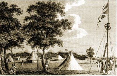 settlement. Sailing with three ships carrying 100 sepoys, 30 lascars,